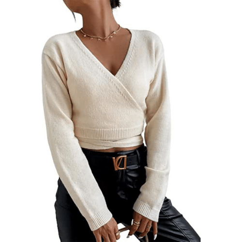 - Features: surplice neck, long sleeve, tie back, crop length