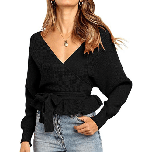 - Sexy wrap v neck in front and back, long batwing sleeve, cute bowknot belt, solid color, ruffle hem detail, stylish slim fit sweater for women.