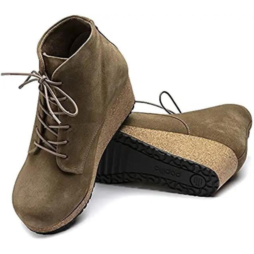 Introducing the Edith wedge ankle boot from Papillio. This simple, compact design provides optimum support, while the heel lengthens your leg and creates a feminine look. Made from soft suede with a non-slip and abrasion-resistant sole, this boot will keep you safe and looking chic all season long.