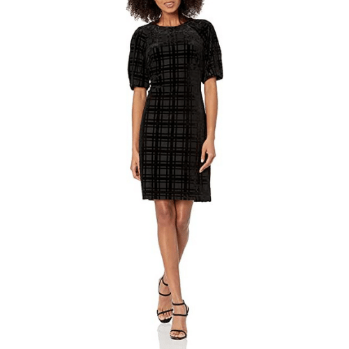 Velvet burnout plaid fabrication; zipper closure at center back. Reviewers love this dress for its great fit and gorgeous look!