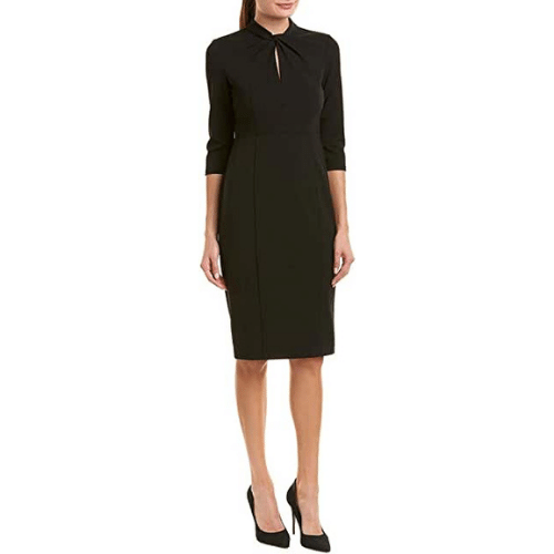 Stretch crepe 3/4 sleeve twisted neckline sheath dress is perfect for that important meeting. Professional, classy and the reviewers love the fit!