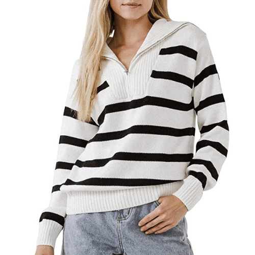 Classic stripe sweater with a fun trndy zip will keep you cozy and stylish on rainy and sunny days!!