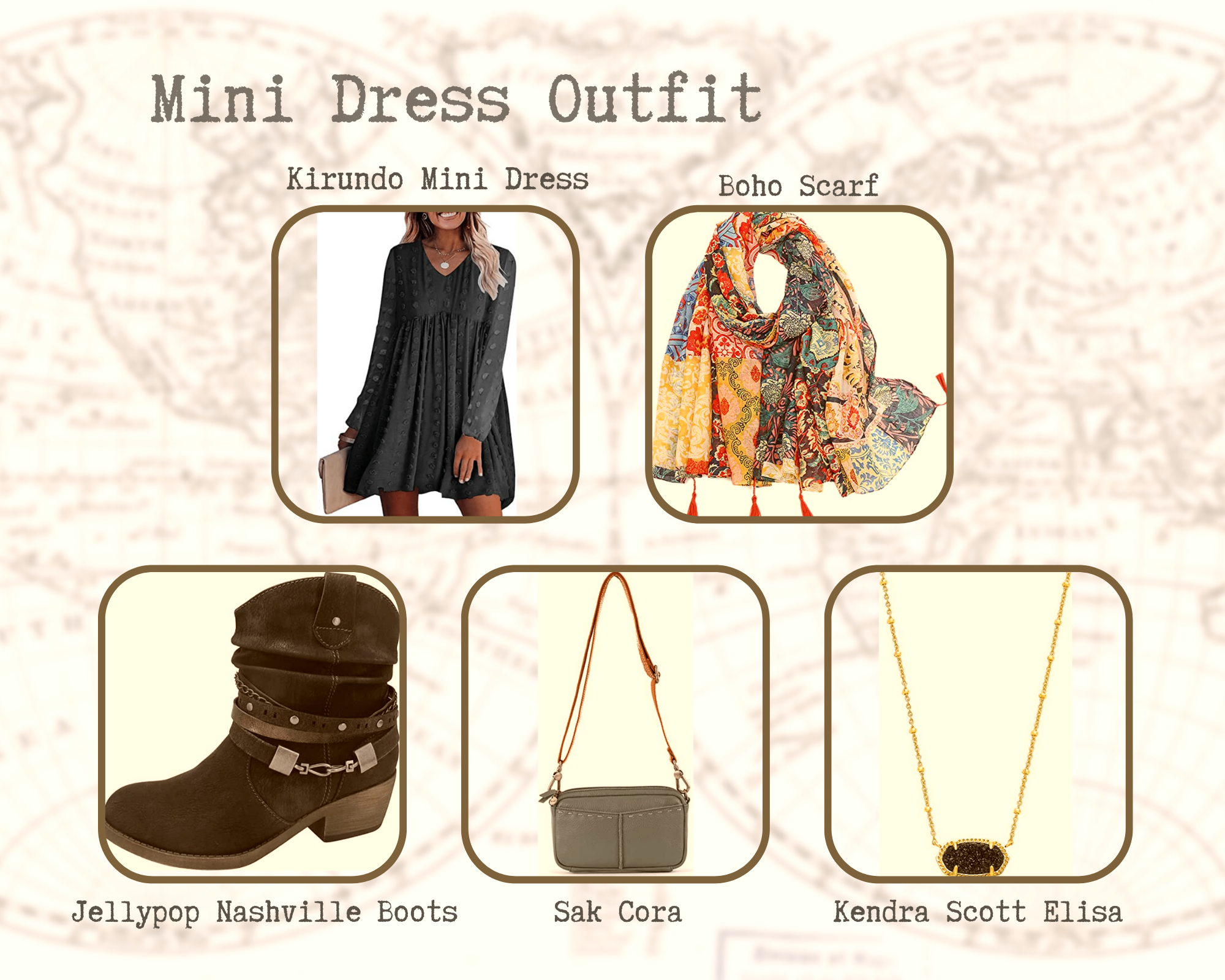 The Kirundo Mini Dress flowy dress is perfect when you want to look put together but also be comfortable at the wineries. We love this option because it's both stylish and comfortable. Pair it with cute Jellyfish Nashville Boots, a boho scarf, Kendra Scott necklace and The Sak Cora crossbody and you'll be good to go! Tap on the links to shop!