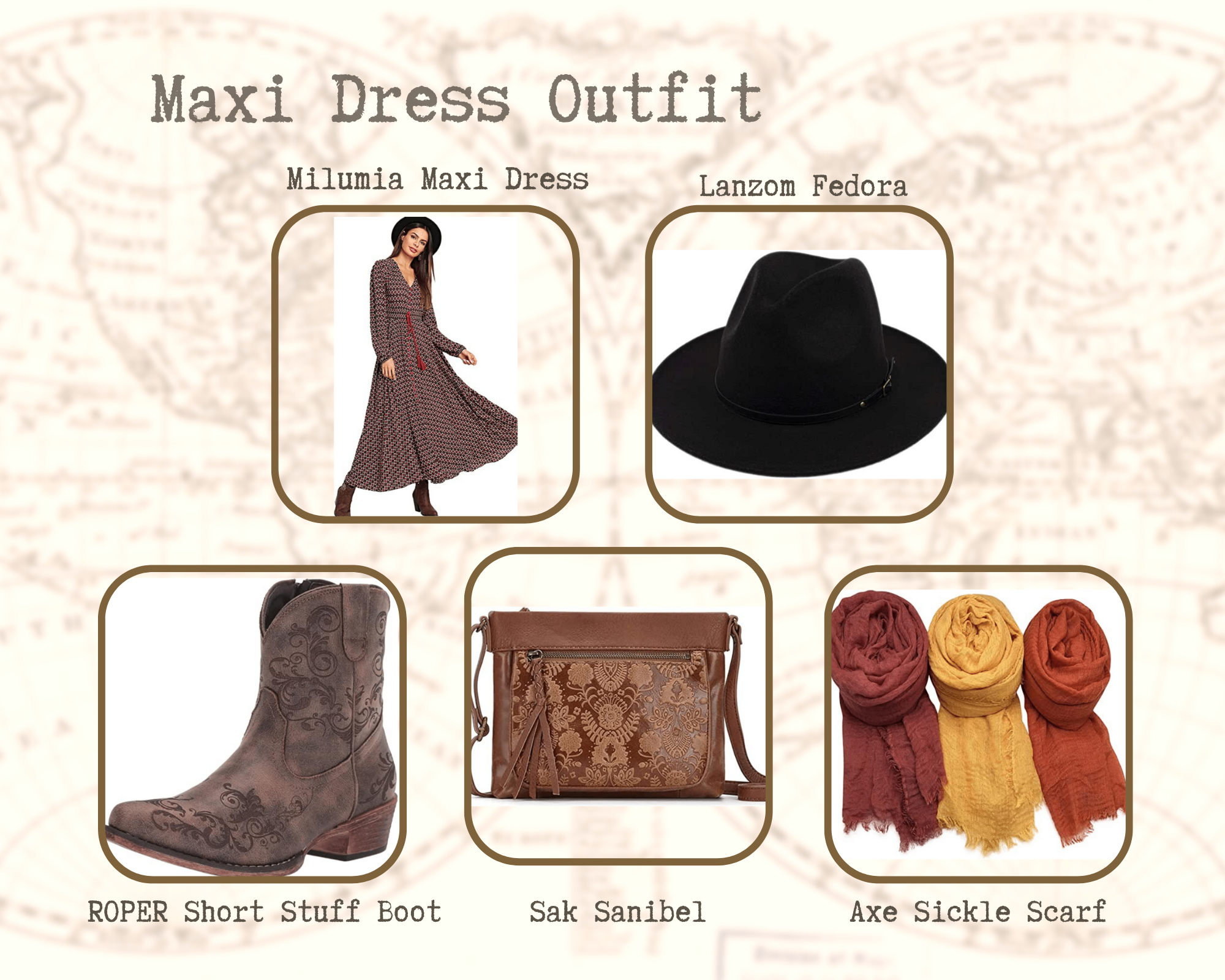 Start with the Milumia Maxi, ad a Lanzom Fedora, pull on this amazing customer fave Roper Short Stuff Boots, add a Sak Sanibel crossbody, and finish with your choice of super soft Axe Sickle Scarf. Tap the highlighted links to shop!