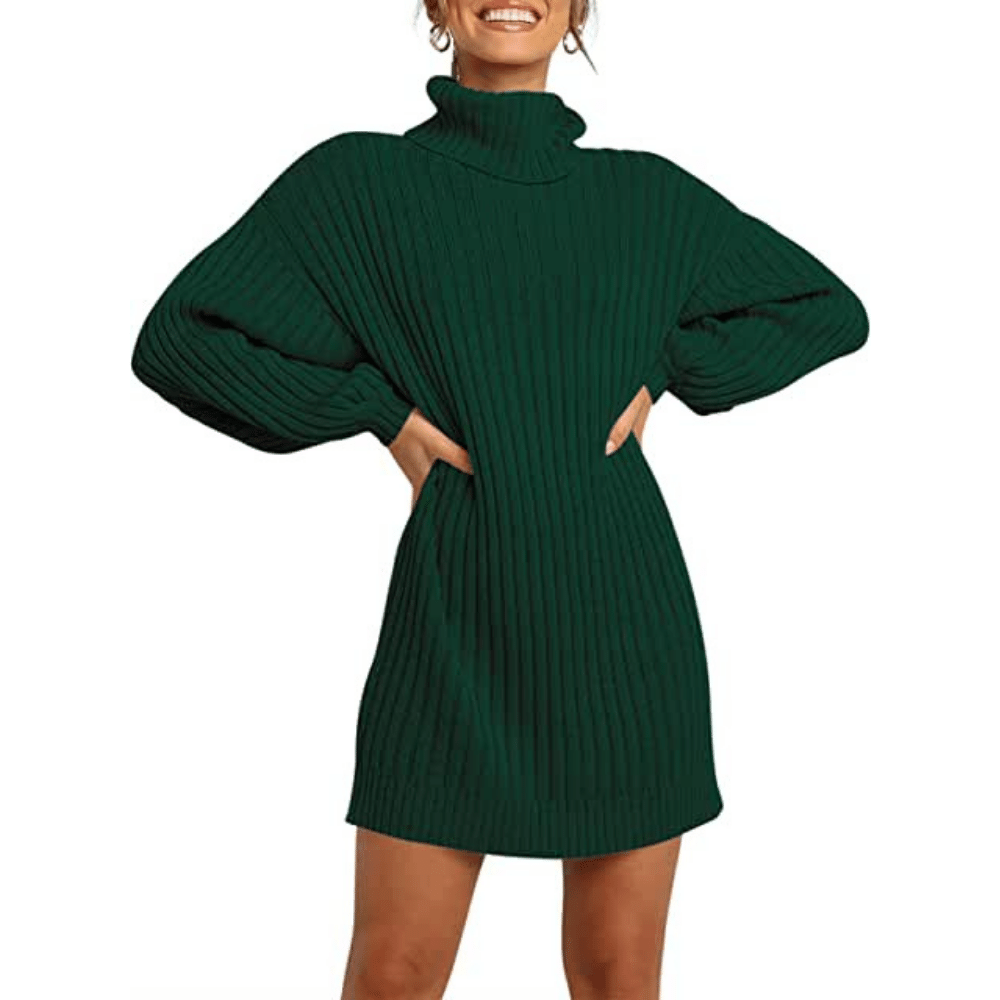 LOGENE Women's Green Sweater Dress Turtleneck Long Balloon Sleeve Ribbed Knit Oversized Pullover Dresses