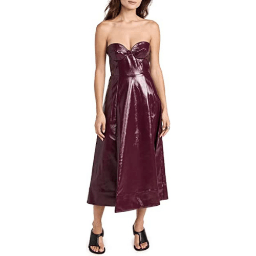 High-gloss faux leather patent finish. Corset-inspired bodice with sweetheart neckline, and optional halter and shoulder straps. Make this your next order!