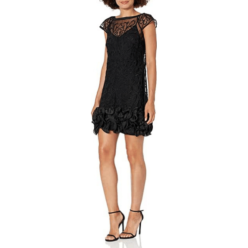 Black ruffle bottom short sleeve dress with a lace overlay is both sleek and sexy!