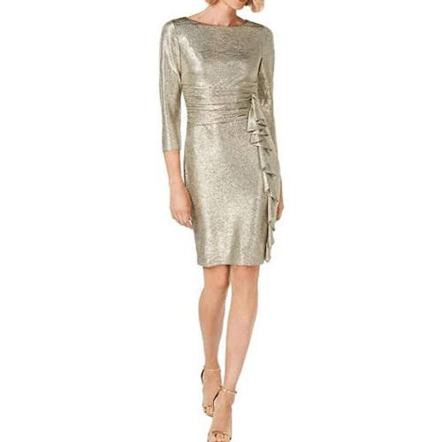 Shine in this fab three quarter sleeve ruched waist sheath dress with cascade ruffle skirt. Pair it with a fun faux fur for your night out!