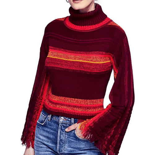 Bright red stripe turtleneck with frayed bell sleeves will keep her warm and stylish. The statement sweater is sure to please!