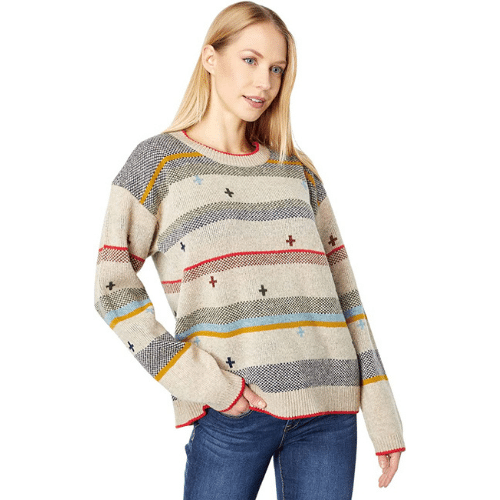 This pullover sweater combines rich, earthy hues in a pattern of stripes and small crosses. Warm 80% lambswool/20% nylon.