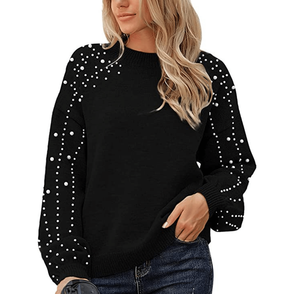 Blooming Jelly Women's Chunky Sweater Crewneck Sweatshirt Knit Lantern Sleeve Oversized Pullover Sweater with Pearls