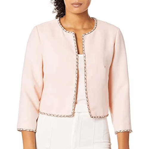 Pretty in pink with this fun chain detail cropped jacket. White jeans and a green handbag will have you looking great and ready for anything!