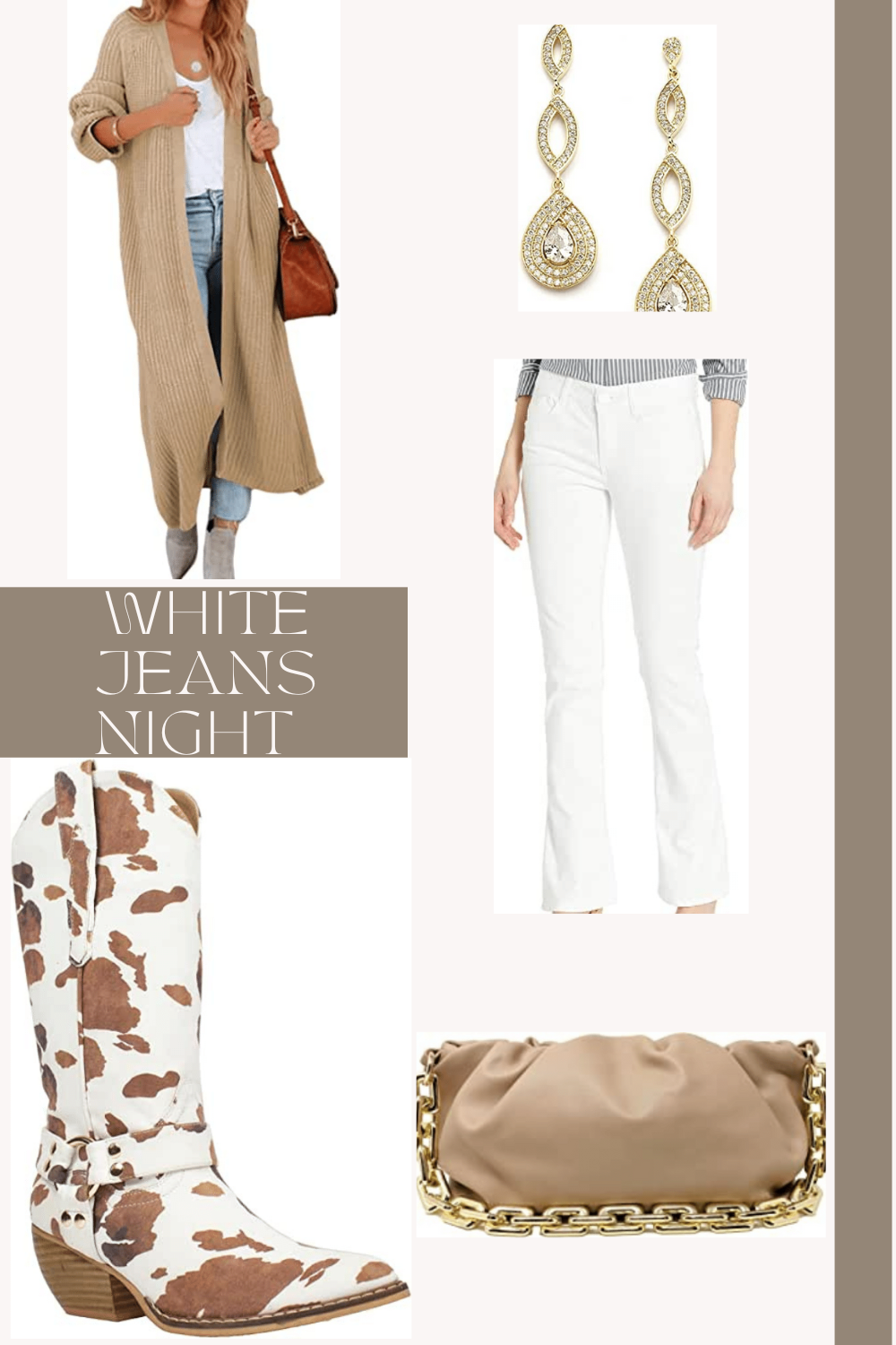 White Jeans ~ Duster Sweater ~ Boots ~ Chain Purse ~ Dangle Earrings