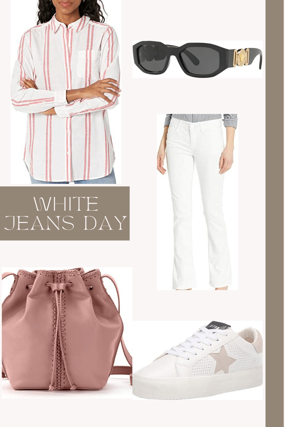 For a daytime look, pair your white jeans with a crisp striped blouse, fun sneaks, a bucket bag, and your best sunnies. This outfit is perfect for running errands or meeting friends for coffee.