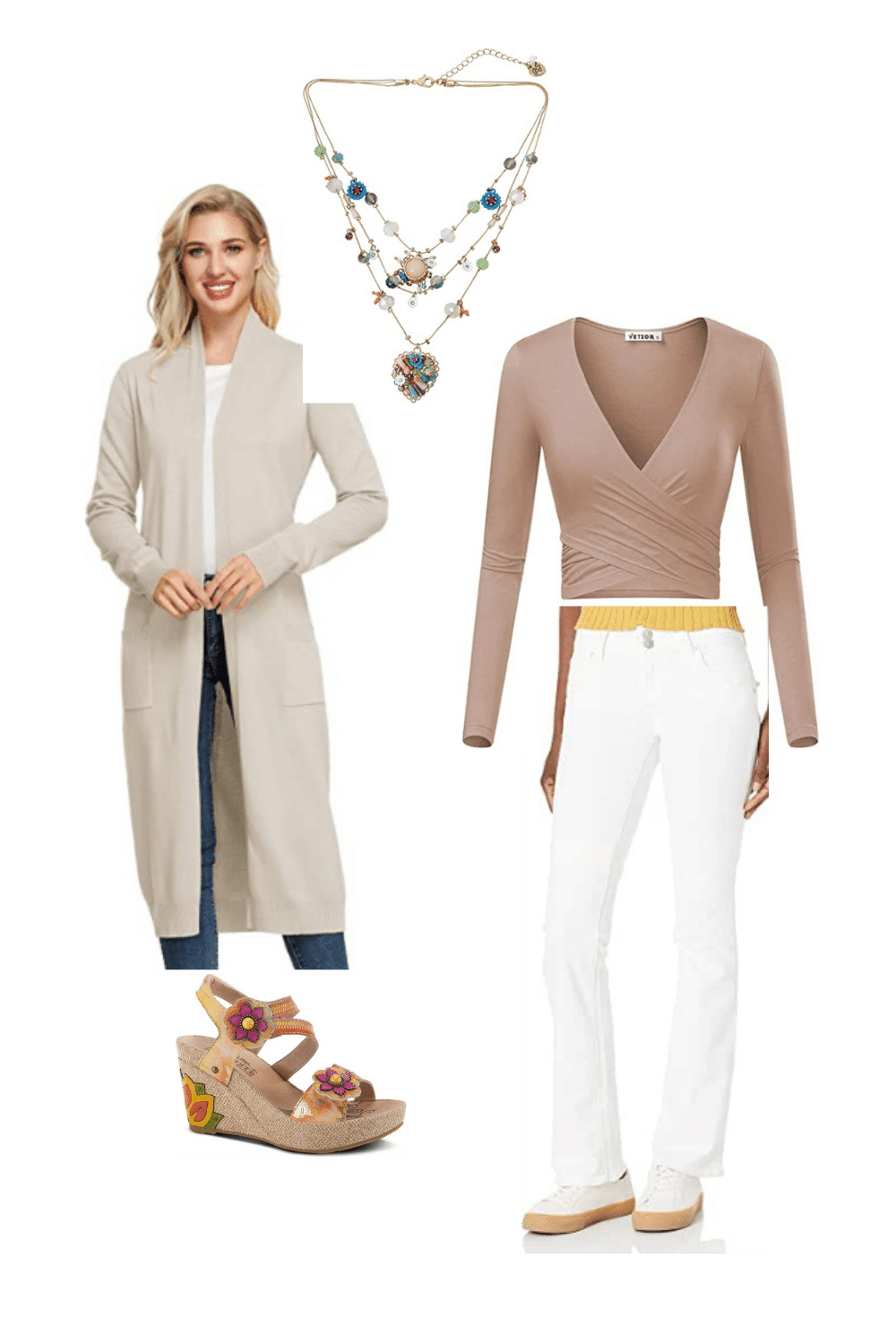 Add a neutral top, pair it with a funky pair of wedge sandals, a statement necklace, and top it off with a flowy cardigan duster for instant style.